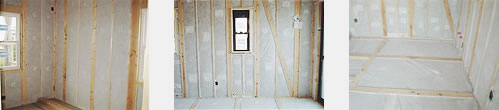 | 天井や床などは、セルロースファイバーの沈降も考え厚みは150〜200m/mを吹き付けます。 |