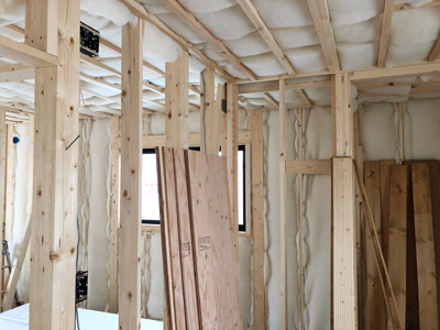 お家の断熱材はサーモウール断熱材。今回のお家(42仕様)では標準の断熱材になっています。この断熱材の一番の特徴は天然の羊の毛・ウールで造られていること。ウールの特徴である調湿性能があり、余分な湿気を吸収し、乾燥時には溜めた水分子を排出して湿度をコントロールしてくれます。