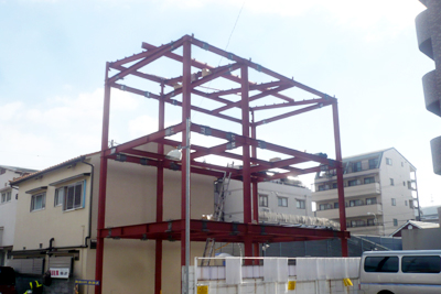| 建て方が終了した鉄骨造の構造体。 鉄骨造は柱・壁が少ないので間取りの自由度外部開口(窓)の自由度が高くなります。 木造住宅の現場より ![]() |