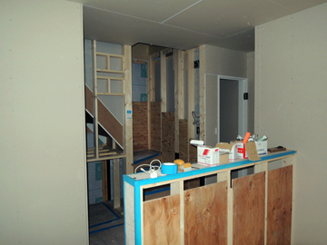 「キッチンで料理をしながらでも家族の動きを確認できるように!!」を考慮しました。キッチンが奥まったところにあり、独立型のようなレイアウトに見えますがキッチンの前に窓を設置することで、キッチン〜バルコニー〜リビングと窓を経由して視界がつながり、キッチンに立ったままでも窓を通して家族の動きを確認する事ができます。リビング、ダイニング、キッチンとそれぞれしっかりとスペースを確保しつながらも、人の動線が重ならないので、ゆったりとした空間造りになっています。![]() ※現在工事中の様子です。 |