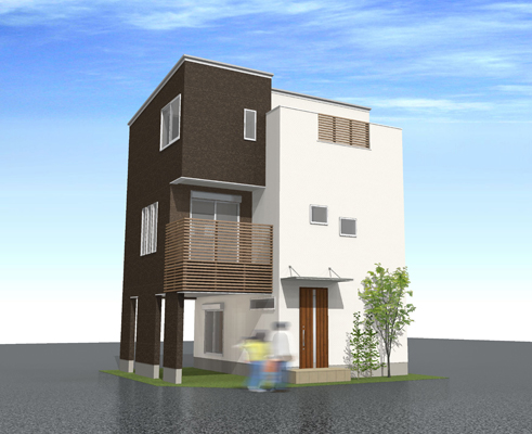2つの箱が重なるような形状の外観を活かし、色と素材を分けメリハリをつけました。![]() ※打合せで使用した外観パースです。 |