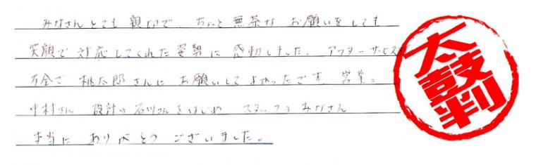 みなさんとても親切で、ちょっと無茶なお願いをしても笑顔で対応してくれた姿勢に感動しました。 アフターサービスも万全で、桃太郎さんにお願いしてよかったです。 営業の中村さん、設計の石川さんをはじめ、スタッフのみなさん 本当にありがとうございました。 |